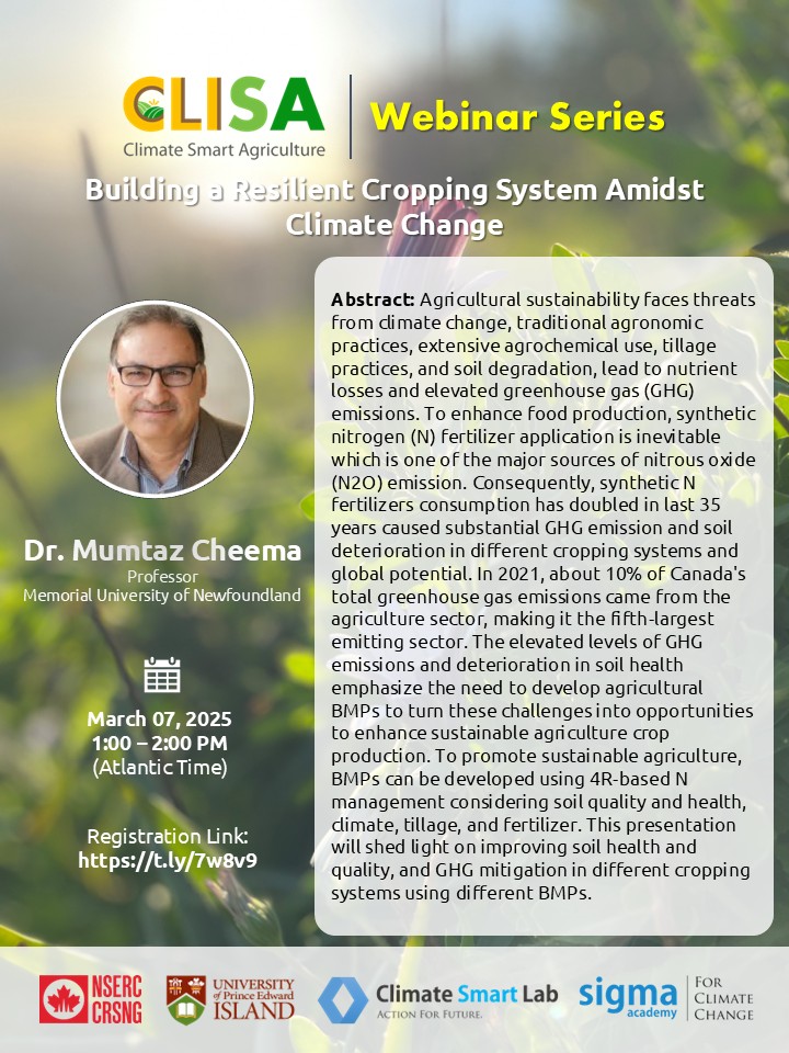 Abstract: Agricultural sustainability faces threats from climate change, traditional agronomic practices, extensive agrochemical use, tillage practices, and soil degradation, lead to nutrient losses and elevated greenhouse gas (GHG) emissions. To enhance food production, synthetic nitrogen (N) fertilizer application is inevitable which is one of the major sources of nitrous oxide (N2O) emission. Consequently, synthetic N fertilizers consumption has doubled in last 35 years caused substantial GHG emission and soil deterioration in different cropping systems and global potential. In 2021, about 10% of Canada’s total greenhouse gas emissions came from the agriculture sector, making it the fifth‑largest emitting sector. The elevated levels of GHG emissions and deterioration in soil health emphasize the need to develop agricultural BMPs to turn these challenges into opportunities to enhance sustainable agriculture crop production. To promote sustainable agriculture, BMPs can be developed using 4R-based N management considering soil quality and health, climate, tillage, and fertilizer. This presentation will shed light on improving soil health and quality, and GHG mitigation in different cropping systems using different BMPs.